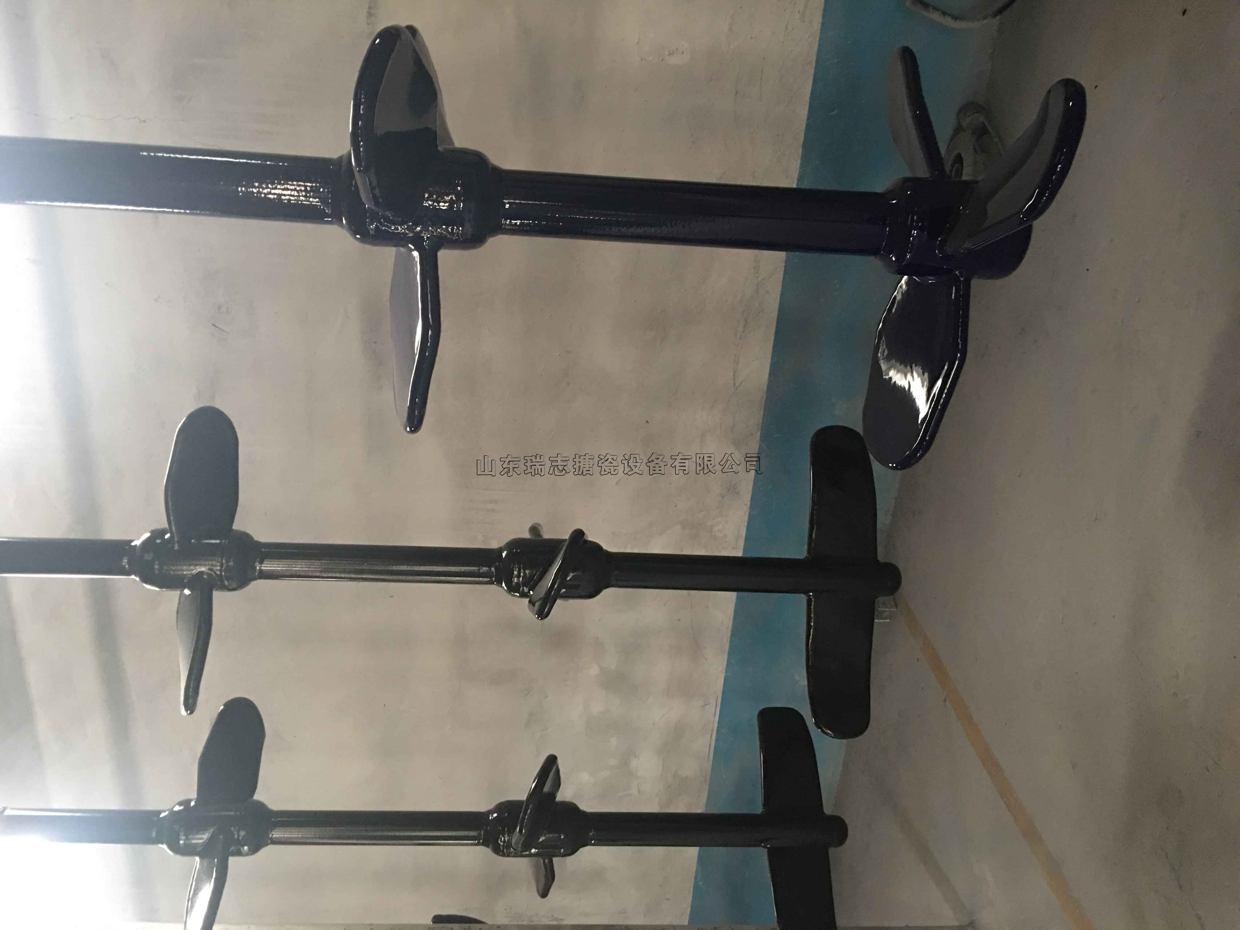 推进式搅拌器,搅拌时能使物料在反应釜内循环流动,所起作用以容积循环为主,剪切作用较小,上下翻腾效果良好。当需要有更大的流速时,反应釜内设有导流筒。标准推进式搅拌器有三瓣叶片,其螺距与桨直径d相等。推进式搅拌器直径约取反应釜内径Di的1/4~1/3,300~600r/min,搅拌器的材料常用铸铁和铸钢。